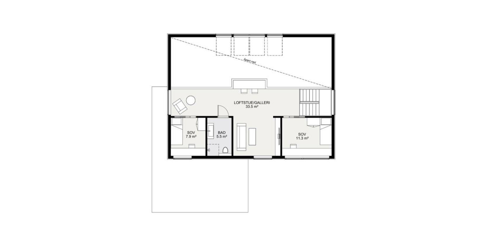 Fellessonen er en åpen stue- og kjøkkenløsning med dobbelhøyde under tak. Her får du en ekstraordinær romfølelse som er helt unik. I andre etasje fungerer den brede gangen som et galleri som er åpent og lyst med mange bruksmuligheter, samt en inntrukken loftstue. Fra galleriet kan man se ned på kjøkken- og stuedelen. Andre etasje rommer også to soverom og et bad.