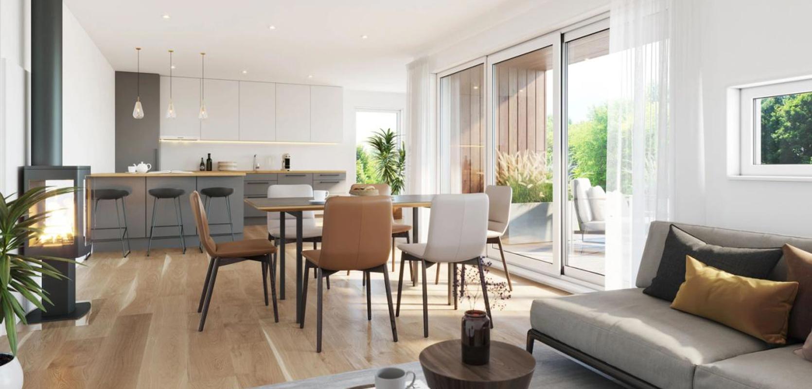 Inngangspartiet har et praktisk overbygg som inkluderer en romslig sportsbod. Et perfekt sted for oppbevaring av alt fra sykler og ski til hageutstyr. Går du inn i huset kommer du først til et vindfang med garderobe. Deretter ledes du inn i det store, åpne oppholdsrommet som har kombinert stue- og kjøkkenløsning. Fra spiseplassen har du flott utsyn gjennom store vindusflater.