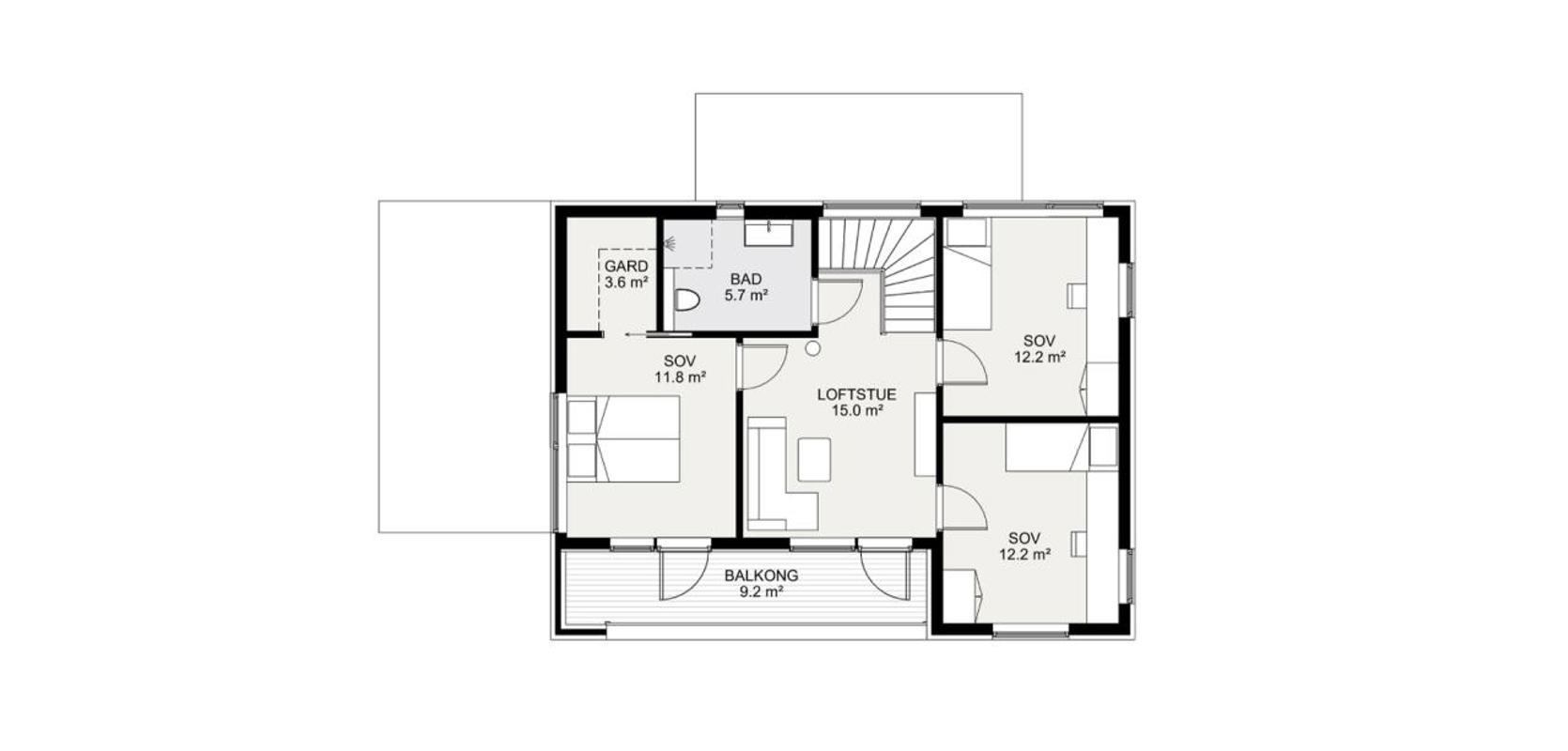 I andre etasje finner du tre romslige soverom, hvorav ett har walk-in-closet og direkte utgang til balkongen. Her er det også en trivelig loftstue med utgang til balkong og et bad med vindu.