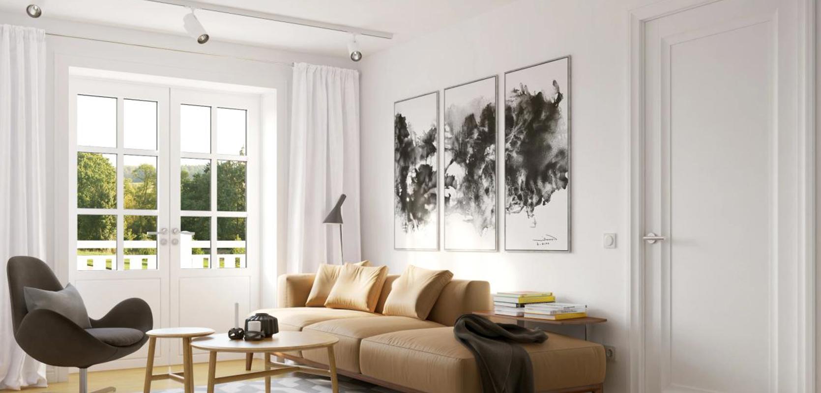 Kjøkkenet ligger i en krok med et stort vindu, noe som gir en intim og koselig, men samtidig lys opplevelse av rommet. Det er også plass til flere sittegrupper i oppholdsrommet, og du vil nyte et fint og lyst område under arken som stikker ut midt på huset. Herfra er det også en dobbeltdør ut mot terrassen og hagen.
