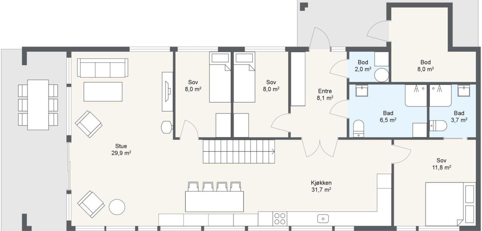 Skyvedører fra fellesområdet fører deg ut til en terrasse som er beskyttet under et takoverbygg. Dette utgjør en flott forlengelse av stue- og spisestueområdet.